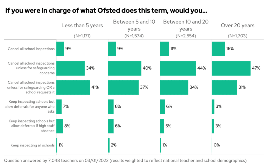 Ofsted inspectors were back inspecting schools in earnest last term. However, rising Omicron cases meant that this term they had to change their approach and pare back inspections. 89% of you wanted Ofsted to cancel inspections this term, although many of you wanted exceptions to be made for safeguarding issues (76%) or schools specifically requesting it (35%).