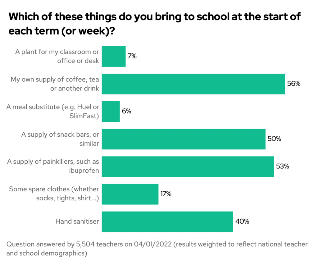 Was it just us, or did that four-day week seem a lot longer? With many of you back teaching, it’s a perfect time to check up on your supplies! 56% of you bring your own supply of hot drinks, as well as those all-important snacks. This hasn’t changed at all since we last asked in 2019 – apart from a new entry in hand sanitiser, which 40% of you are now bringing in regularly.