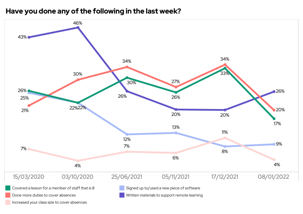 There was a drop in the percentage of teachers covering for ill staff members compared to before Christmas. Just before the holidays, 33% of you had covered for an ill staff member. So far this term, the percentage has almost halved, down to 17%. Possibly this is because the higher student absence rate has made it easier to combine classes, or because of greater availability of supply staff who were avoiding school ahead of Christmas in order to avoid isolation.