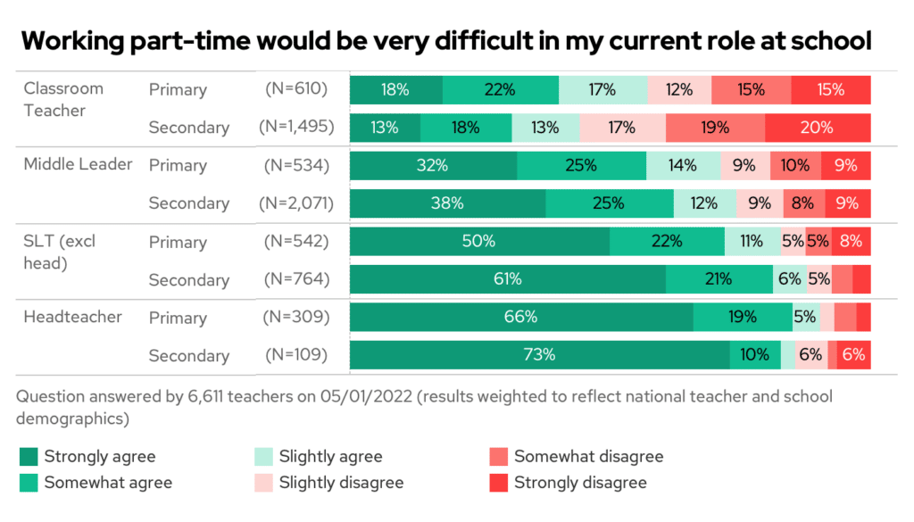 On the other hand, headteachers are nearly all in agreement that working part-time is difficult – with 89% in agreement.