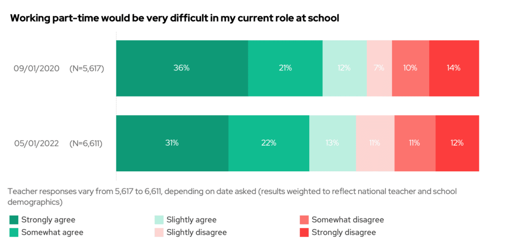 The prospects for part-time working hasn’t changed much in schools since the start of 2020 (pre-pandemic!). In both cases, two-thirds of you agreed that working part-time would be difficult. Hence, while other sectors have become much more flexible, it doesn’t seem like schools are changing at the same rate.