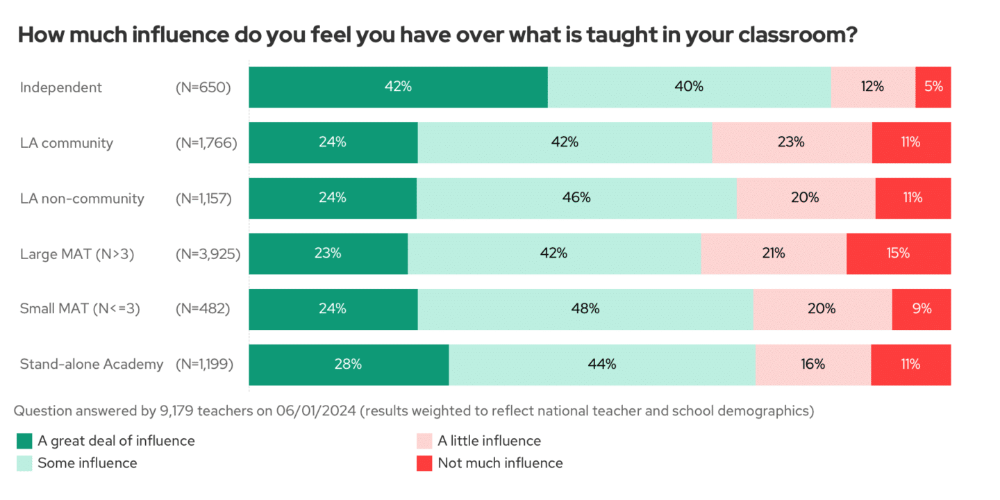 While it’s not surprising that private school teachers feel they have more classroom influence, it is interesting that academy teachers don’t always feel the same, especially those in large Multi-Academy Trusts (MATs). One of the original aims of the academy system was to grant more autonomy, making this finding noteworthy.