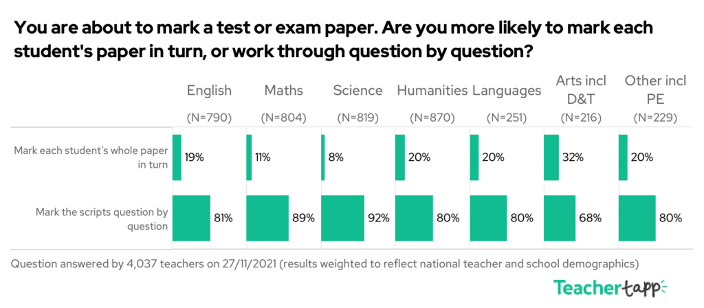 Marking question-by-question is most popular among most maths and science teachers, where 90% of teachers say it’s their preferred way. On the other hand, art teachers appear to be bucking the trend. 32% of art teachers prefer marking each student’s paper at a time – what is it about them that makes this a more common approach?