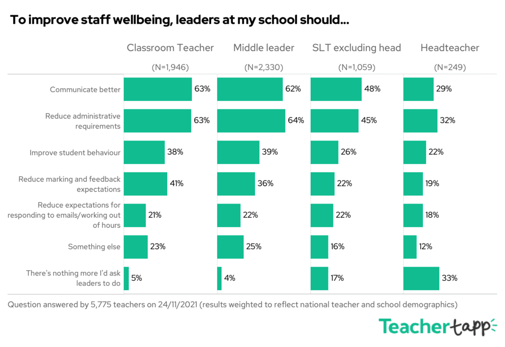 But how can we improve staff wellbeing? Nearly two-thirds of classroom teachers and middle leaders think that better communication would improve staff wellbeing. 63% of classroom teachers were also clamouring for a reduction in admin requirements to improve their wellbeing.