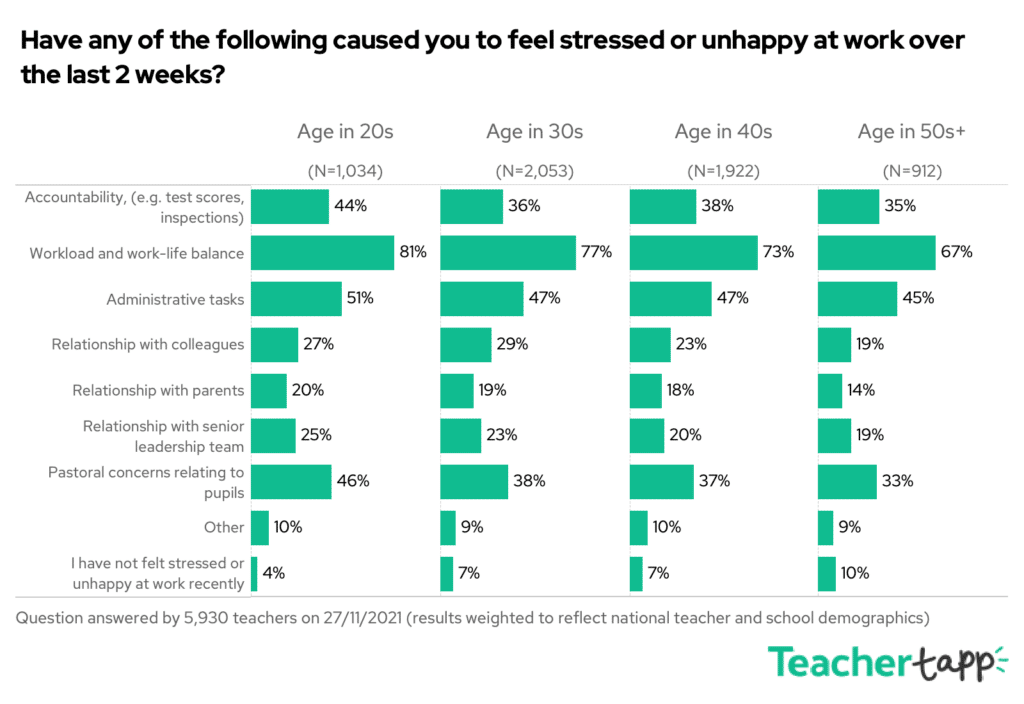 Younger teachers also cite pastoral concerns as a drain on their wellbeing. 46% of teachers in their 20s say this, compared to 33% of those in their 50s+. Perhaps older teachers have had more experience dealing with pastoral issues in the past and so are more able to not let it stress them out as much!