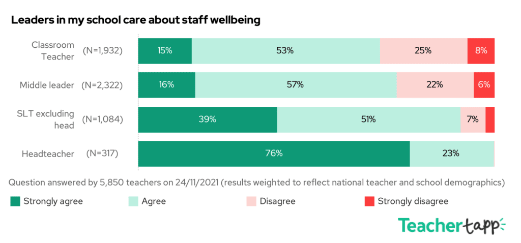 One-in-three classroom teachers reported that their leaders don’t care about staff wellbeing, yet 99% heads asked said that they do. Is the difference due to the perceptions of staff when faced with the reality of their day-to-day duties?