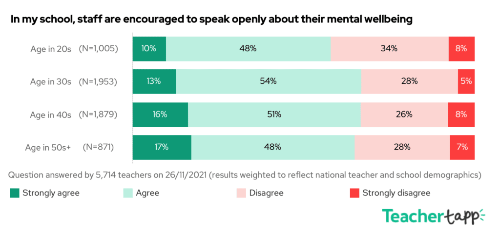 Over one-in-three teachers don’t feel able to speak about their mental wellbeing in school. In particular, younger teachers are more reserved than others – where 42% of teachers in their 20s do not feel able to speak about their wellbeing.