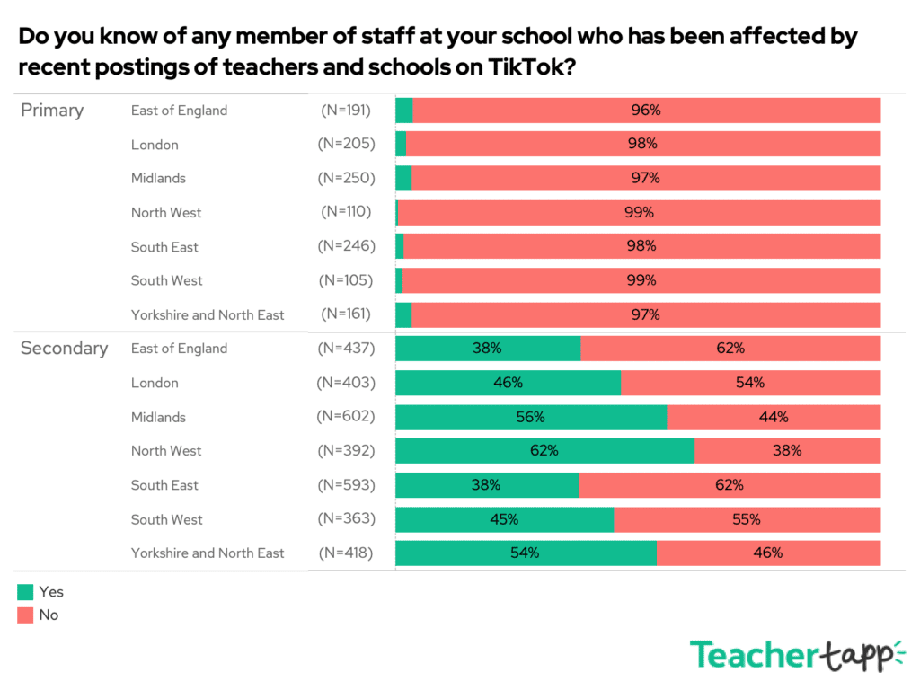 Just 3% of primary schools say that a member of staff has been affected by the TikTok postings. However, half of secondary school teachers say that they know someone at their school who has been affected. In particular – more female than male teachers say that they know someone affected (52% vs. 46%).